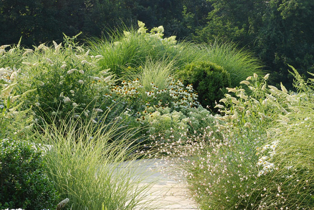 Boxwood, grasses and perennials, including sedum frosty morning, echinacea white swan and a white butterfly bush, comprise the “white garden” on the upper terrace. Though some blue-flowering plants intermingled, the blues do not show up until sunset, when the angle of the late afternoon light emphasizes the color.
