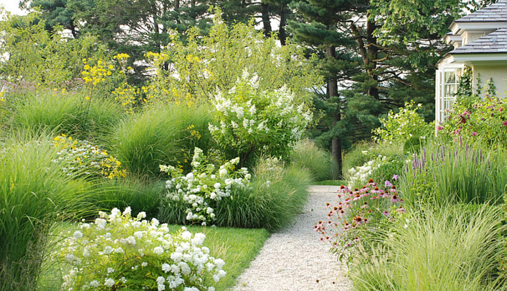 A pea-stone path leads through the perennial garden at the guest house. In this case, the stones bleed into the grass, softening the garden in the Chatto style. Soft paths are typical of French gardens.