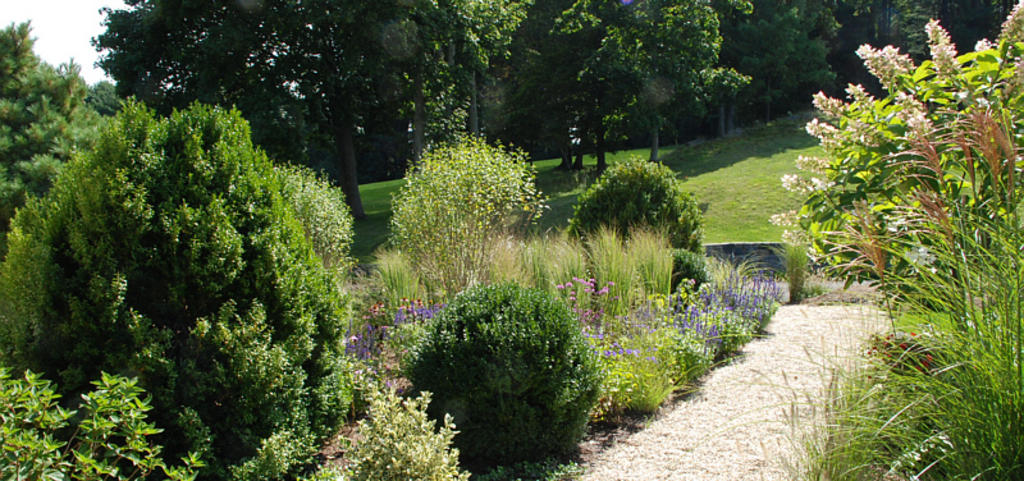 The boxwood, perennials and grasses that border the pea-stone path will soon grow over the edges and soften the total effect.